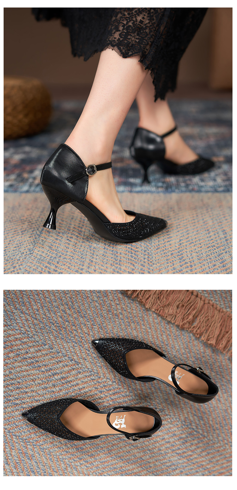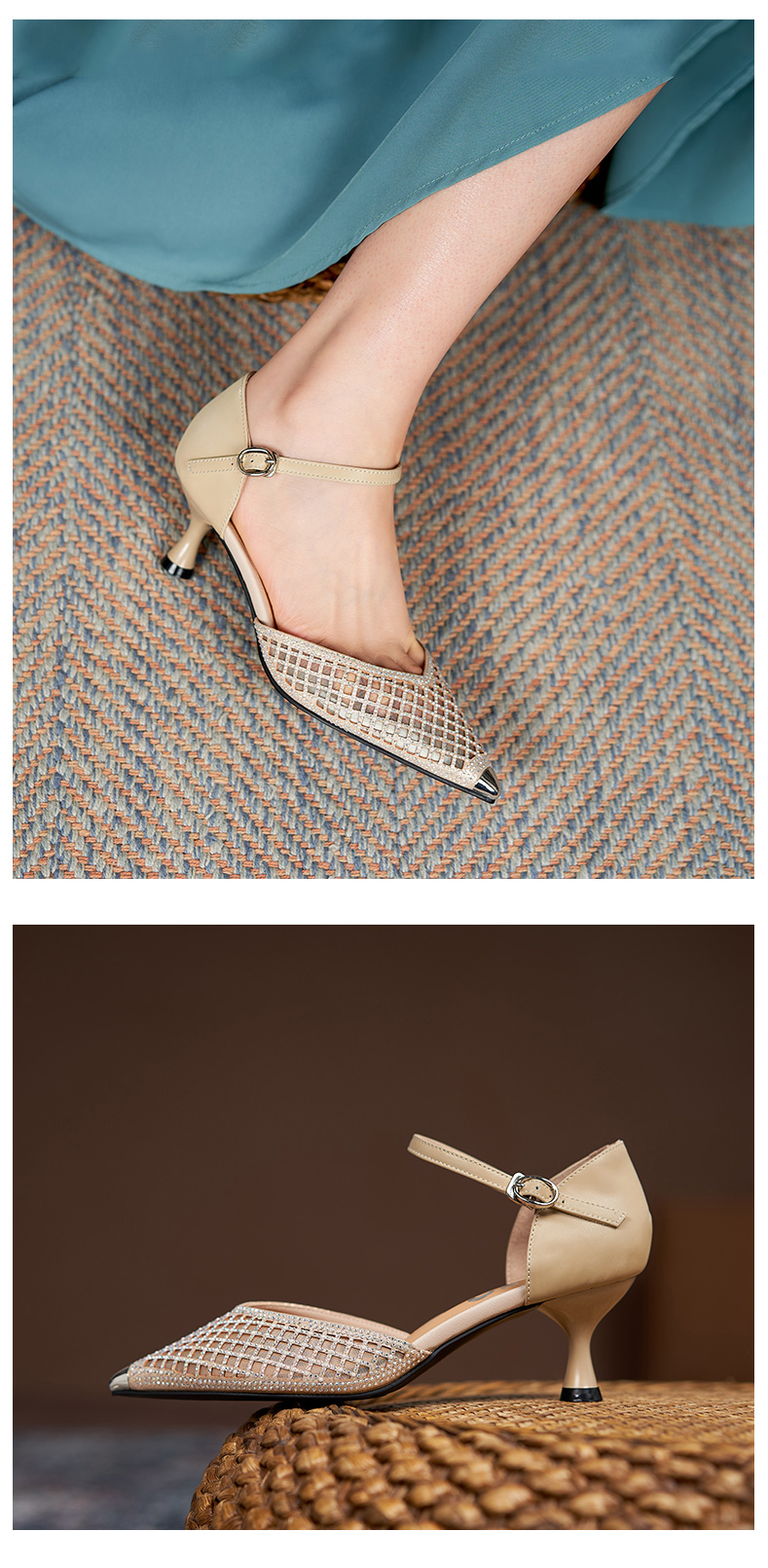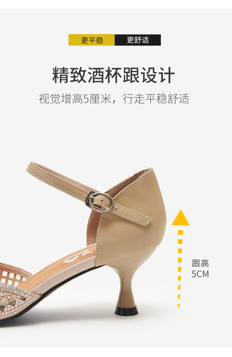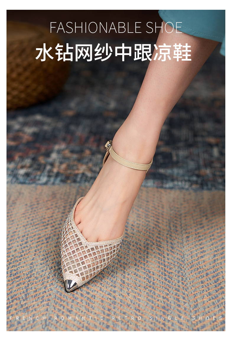 細(xì)跟包頭涼鞋女2021年新款夏中跟單鞋帶鉆鏤空網(wǎng)紗一字帶羅馬涼鞋